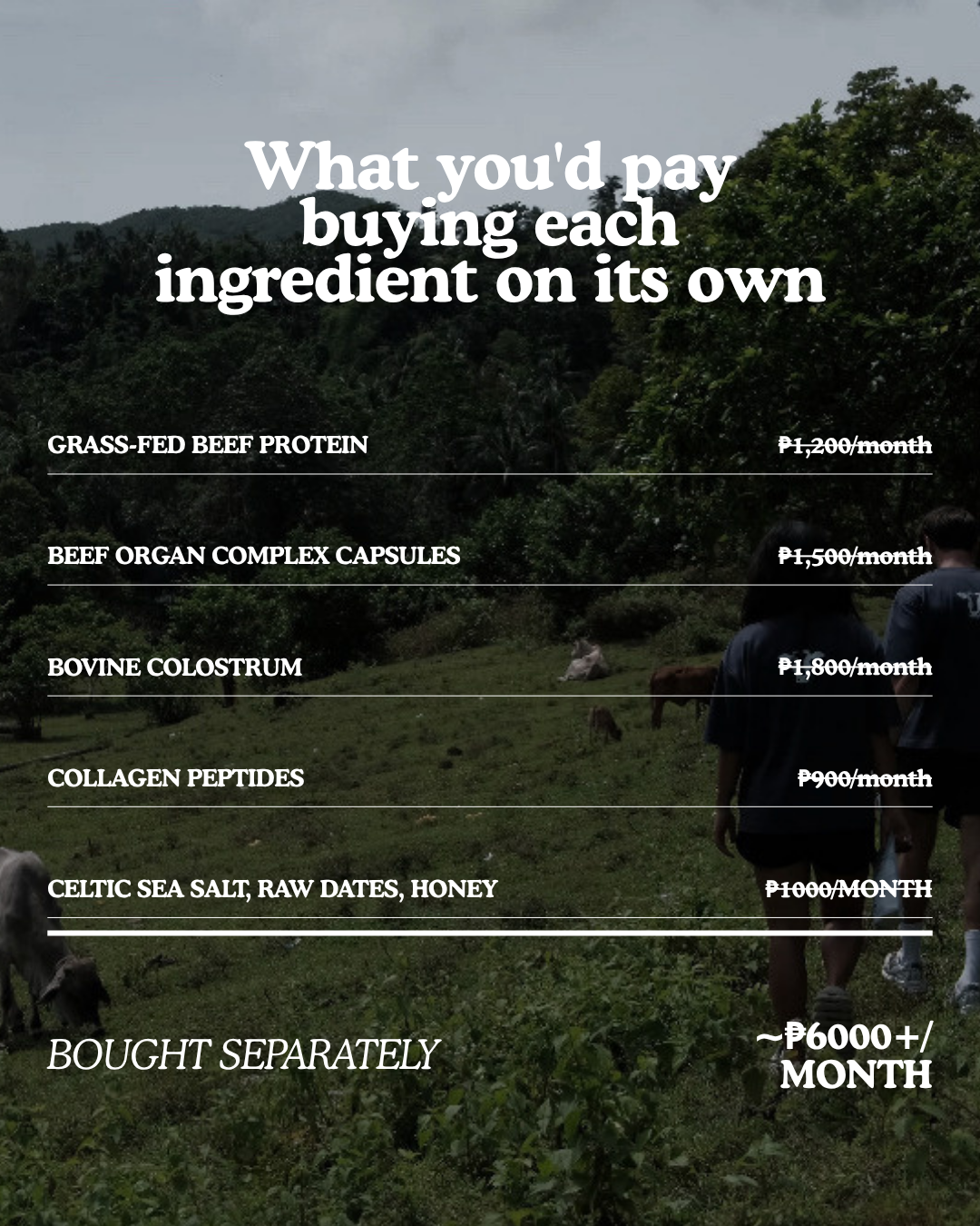 With Otherside Nutrition, it's less than your daily coffee. Each scoop gives you grass-fed beef protein, organ complex, colostrum, and collagen, raw cacao, and sweetened naturally by honey and dates — ingredients that would cost you ₱6,000+ a month to buy separately.